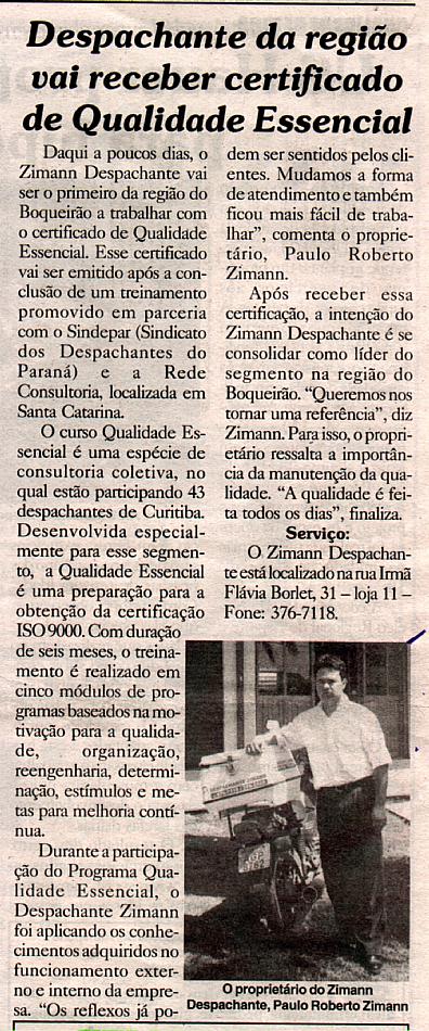 Curitiba - PR SINDEPAR - Sindicato dos Despachantes do Estado do Paraná Projeto Qualidade Essencial Matéria Veiculada na "Folha do Boqueirão" no dia 24/11/99.